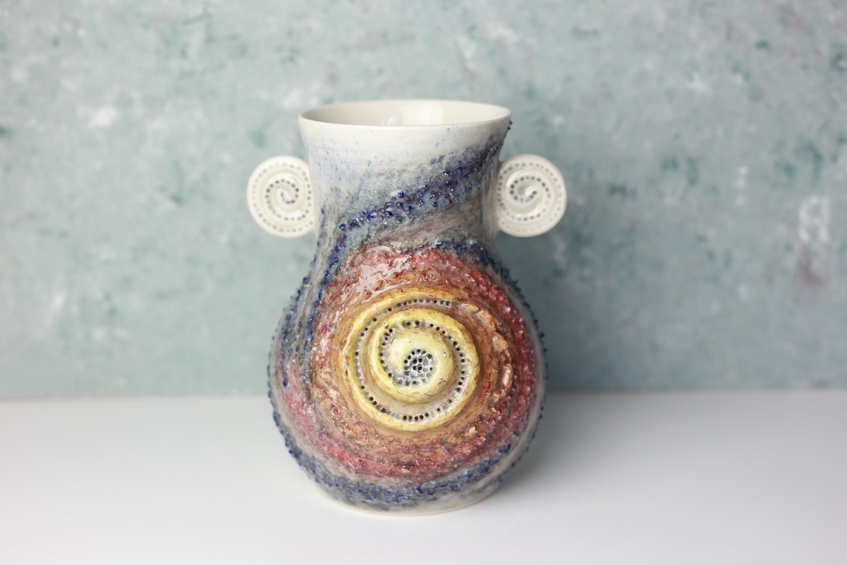 This is my second year of buying pieces for Christmas from this ceramic artist. This is an absolutely beautiful vase in its elegant shape, various textures and its use of two complementary glazes. The subtle textures on the side are exquisite. It is also practical with its interior glaze for use as a vase, which I appreciate as a floral designer. I am fortunate that the daughter I gave it to asked me to keep it for her till she gets settled after college, so I can enjoy seeing it daily till then.