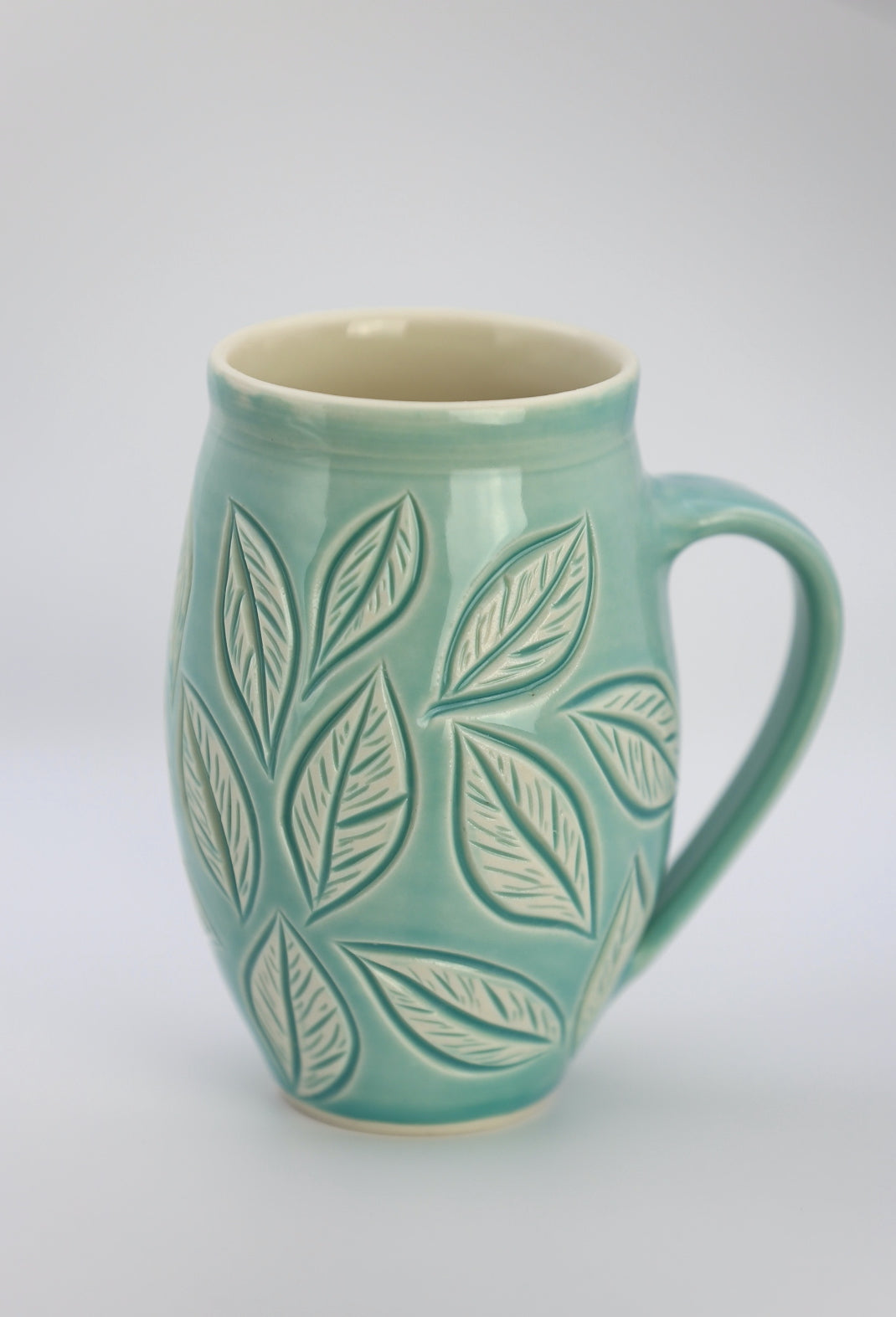 It is made of high-grade porcelain and is hand-carved on a wheel-thrown and trimmed porcelain mug. The mug is coated with a semi-clear turquoise glaze and fired at 2200 F. Inside of the mug is coated with a clear glaze.