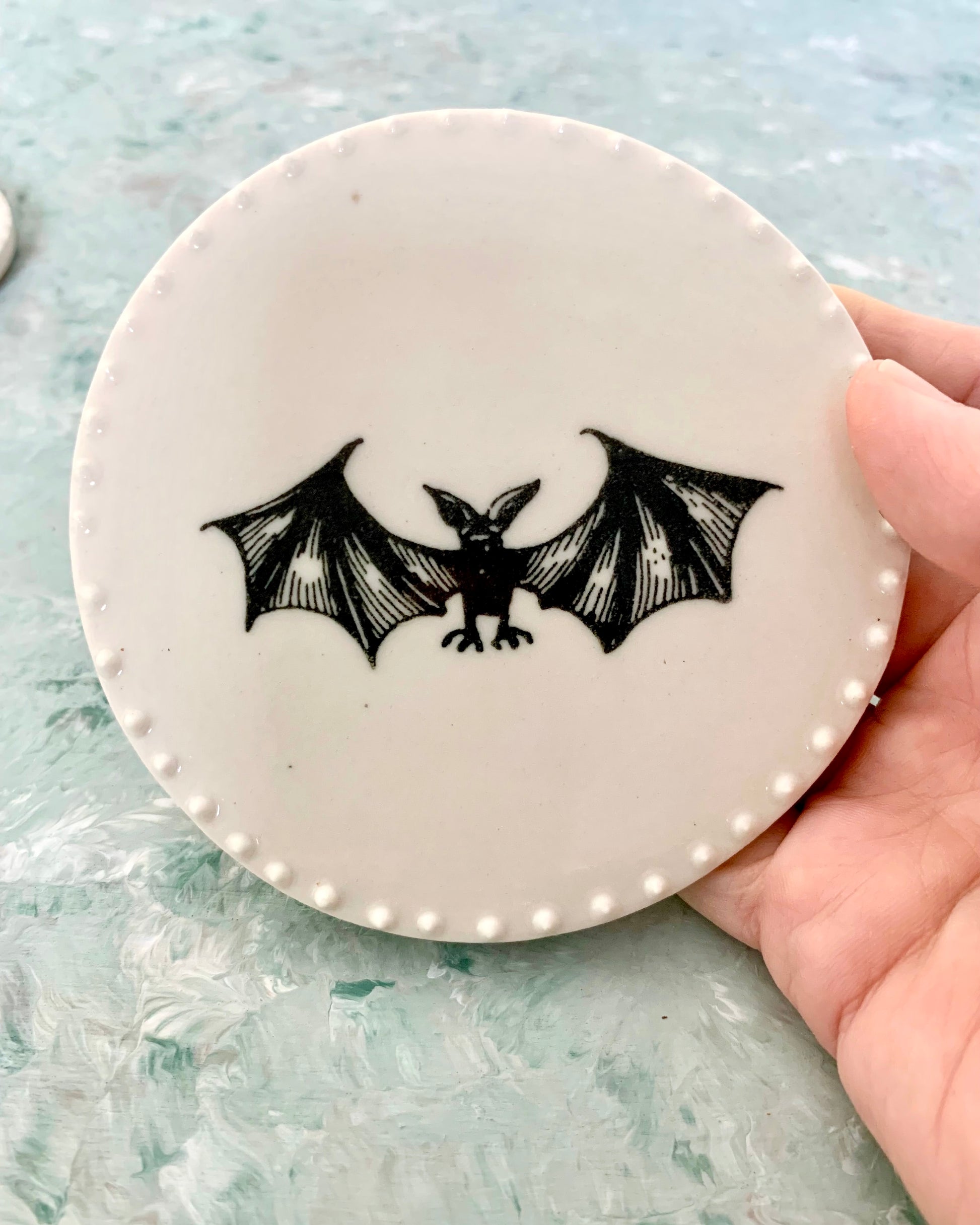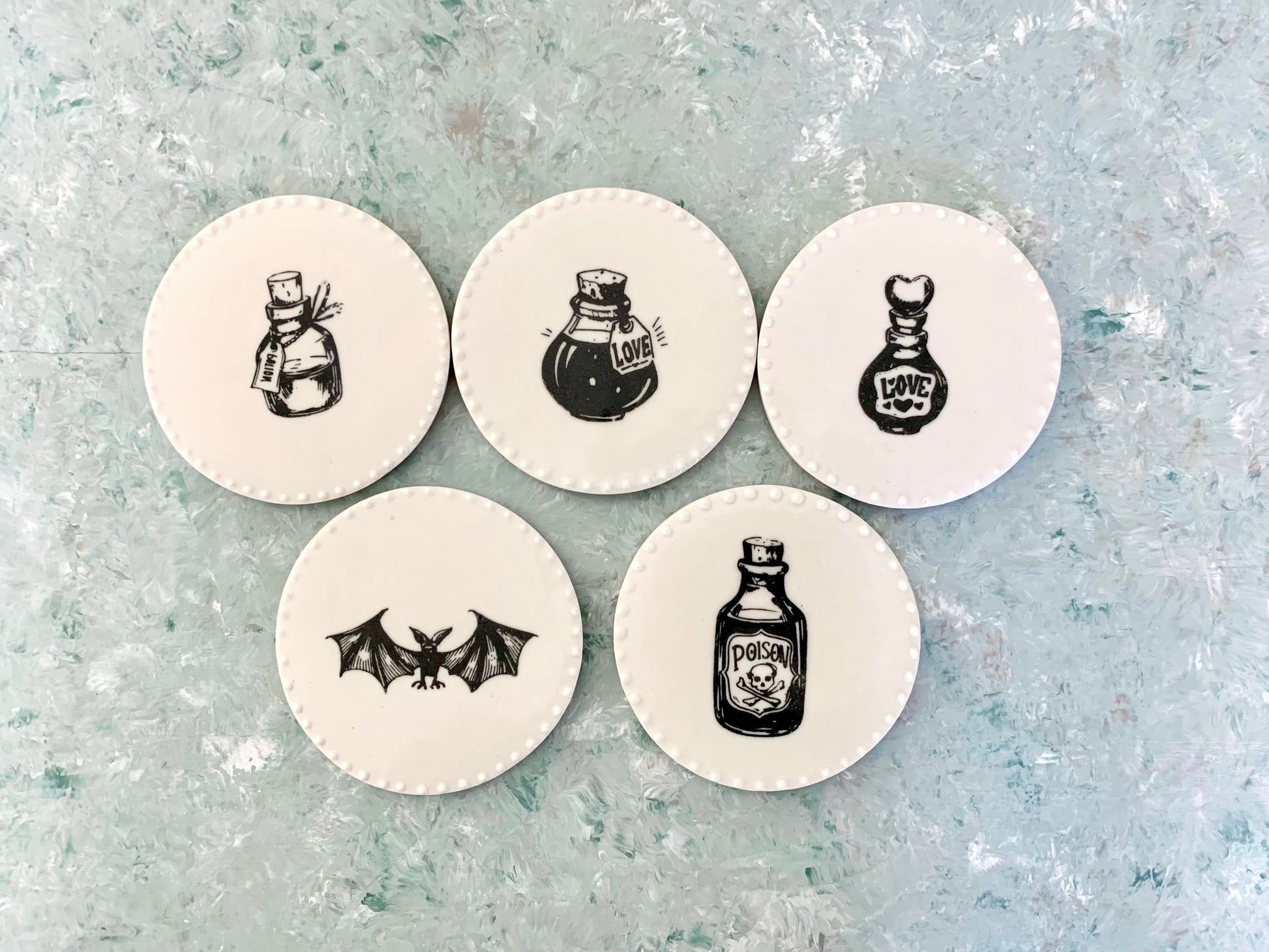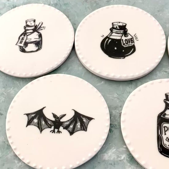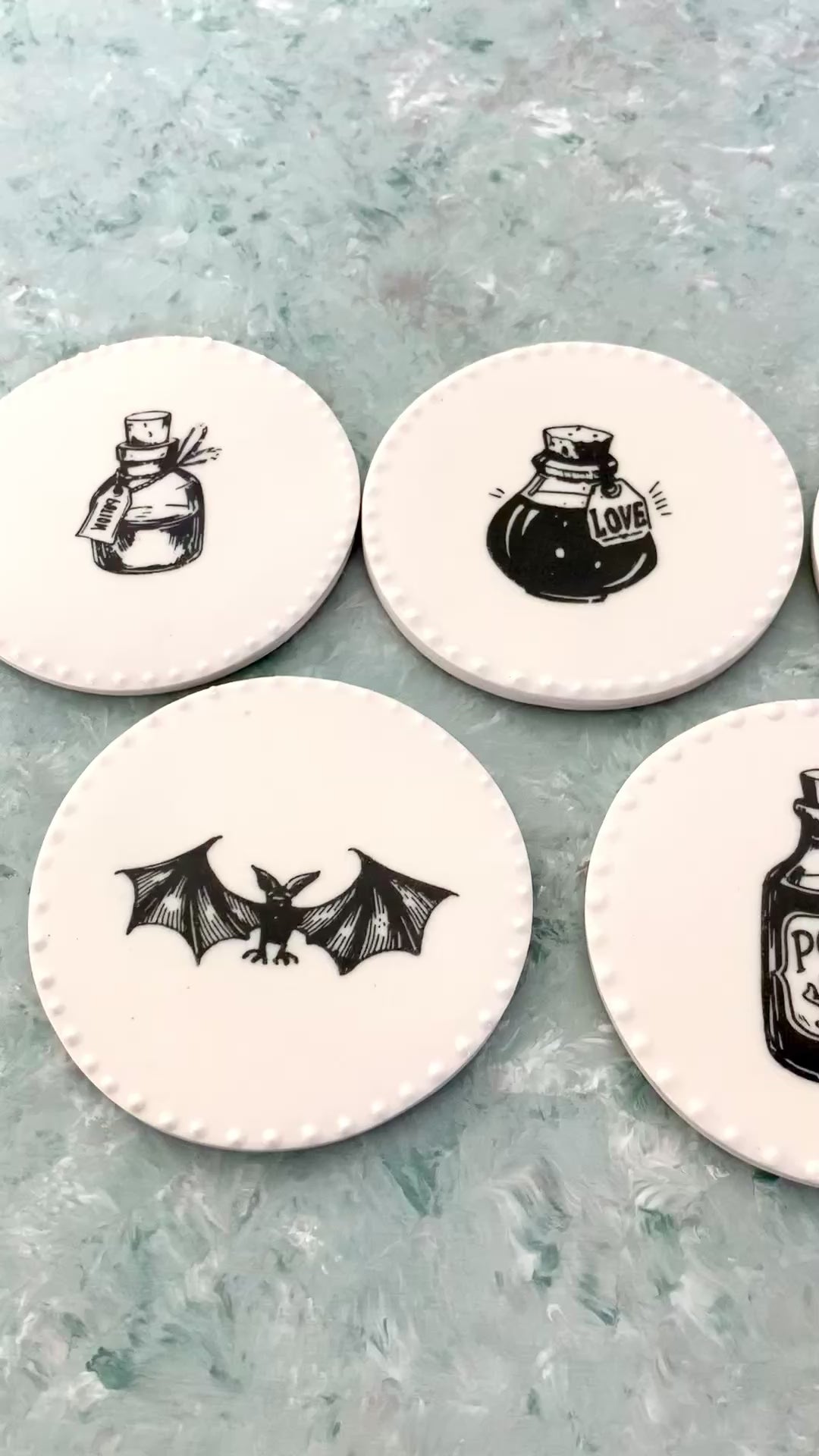 Handmade Halloween porcelain coasters. Five styles available and will be shipped out randomly unless specified.