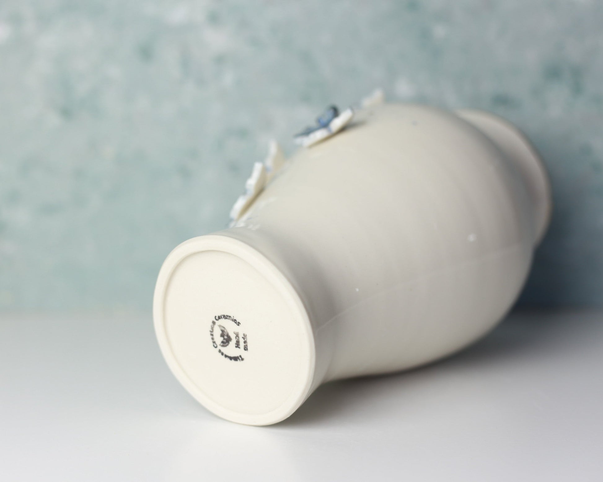 This handmade porcelain vase celebrates transformation, lightness, and the divine spark within us all. Each butterfly is individually sculpted by hand, carefully hand-painted in delicate blue tones, and highlighted with 22K gold accents—on their wings, between them, and around the rim. The vase is fully coated inside and out with a glossy clear glaze, giving it both durability and a luminous finish.