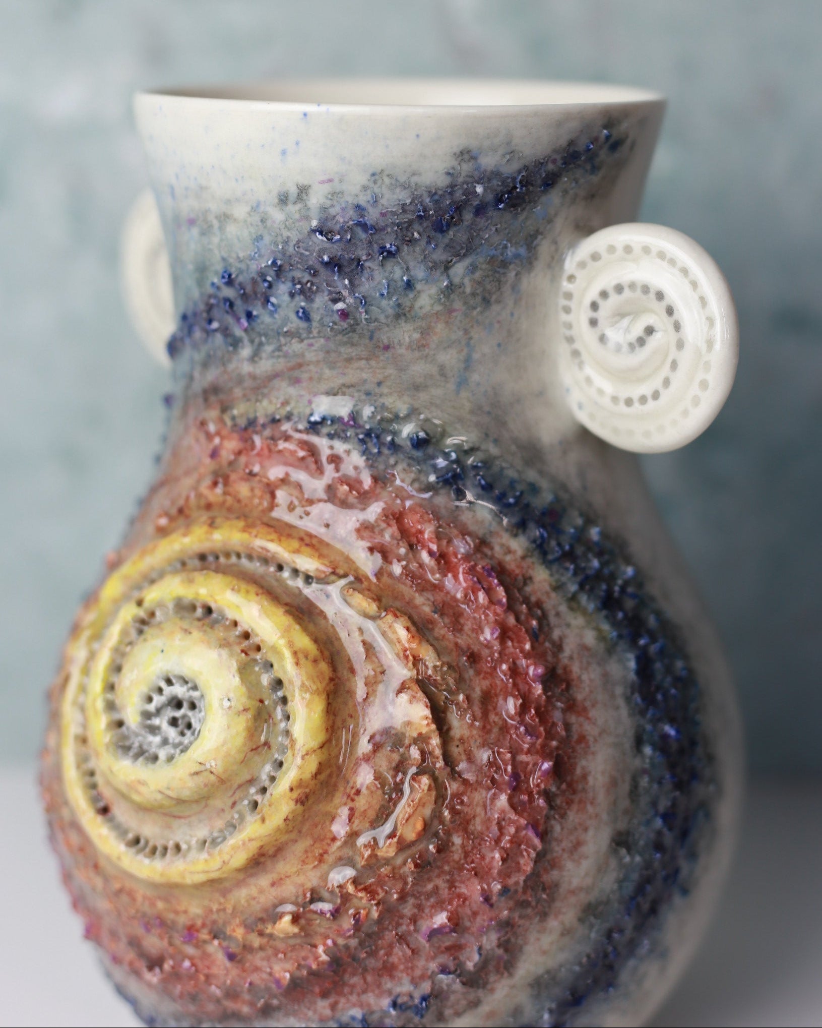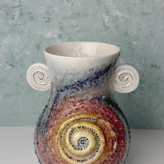 The sculptural surface is richly textured, alive with color, and accented by dual spiral handles that echo the central theme. Both functional and symbolic, this vase is a striking centerpiece for any space, whether holding flowers or standing as an art piece on its own.