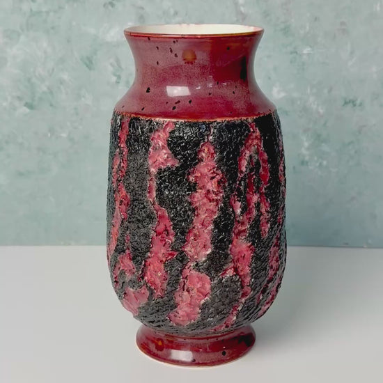 Handmade Porcelain Lava Vase – Hand Carved & Painted Ceramic, Dark Red, Black Textured Pottery