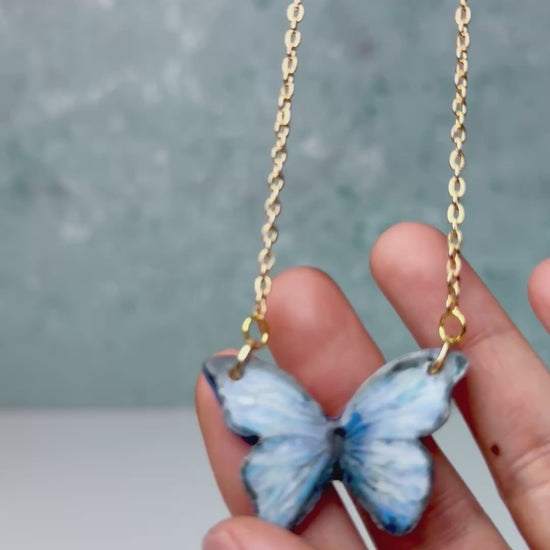 Handmade Porcelain Butterfly Necklace – blue green realistic butterfly pendant, 20 inch chain length